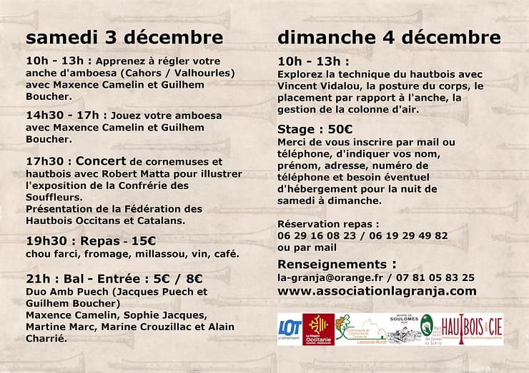 Fête des hautbois samedi 3 et dimanche 4 décembre 2022 à la Grange du Causse de Soulomès